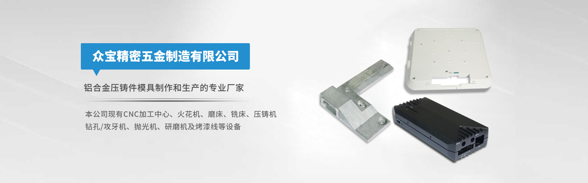 東莞市東城眾寶精密五金制造有限公司 鋁合金壓鑄件模具制作和生產(chǎn)的專業(yè)廠家 實(shí)現(xiàn)從圖紙-模具-壓鑄-機(jī)加-清理-拋光研磨以及表面噴油處理一站式的優(yōu)質(zhì)服務(wù)